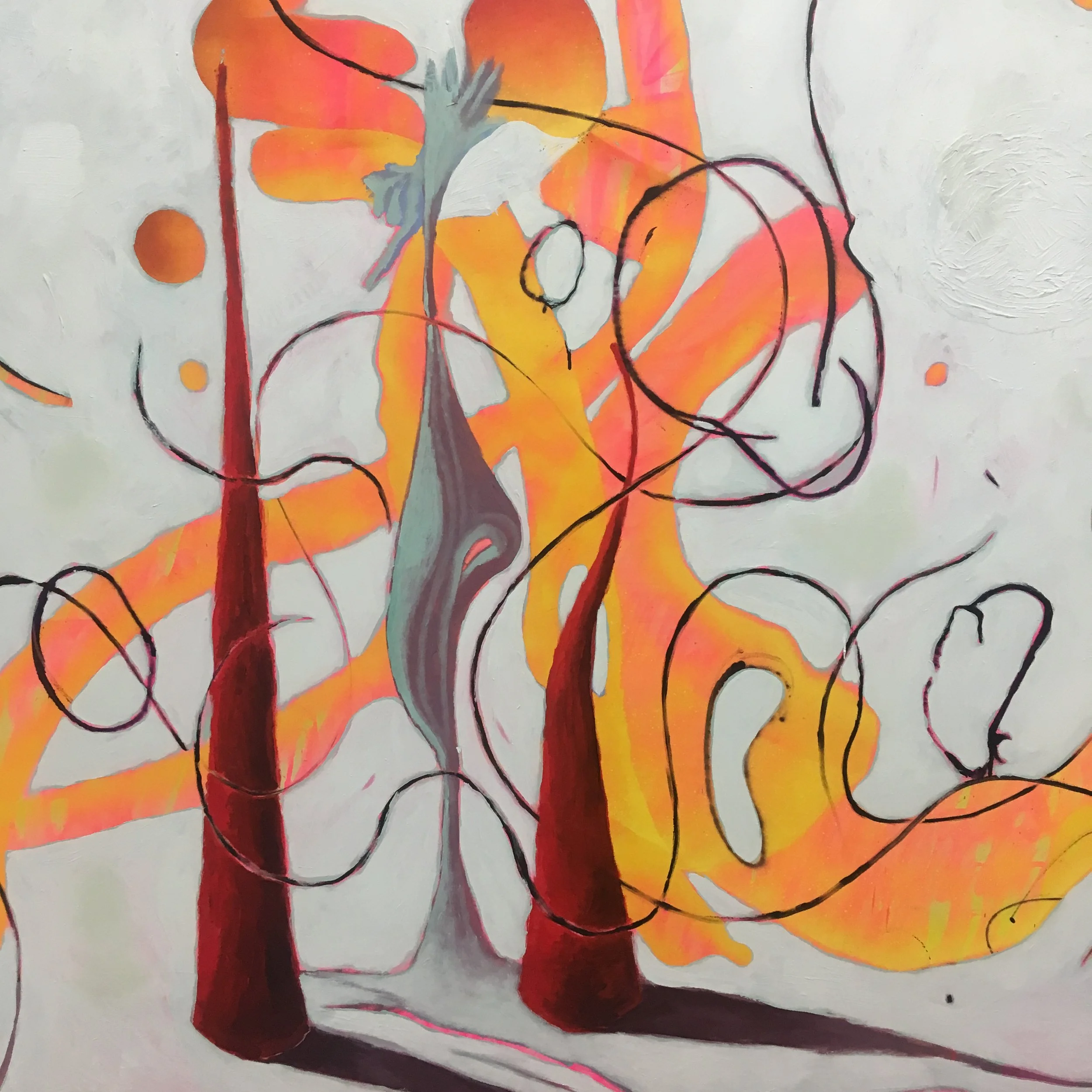 All of my work starts out as improvisation, I do not necessarily research topics. I use my full body and mind when I create, and find themes and messages to pursue during the painting process.
